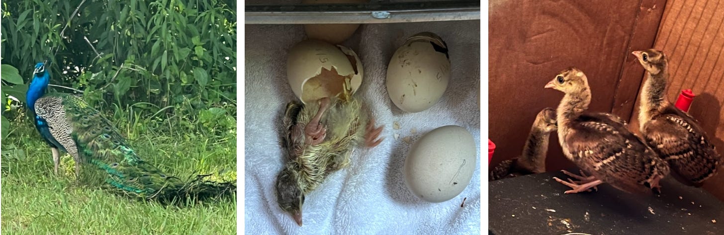 We collect one or two peacock eggs a day, save them up and then place them in the incubator each week. On Sunday, they get put into the brooder area for hatching.