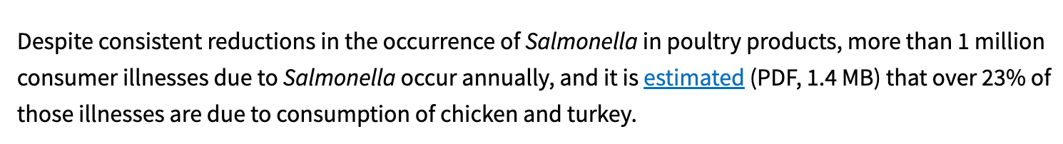 Therefore, according to the USDA, 1 million x .23% = 230,000 people are sickened by Salmonella associated with the consumption of chicken and turkey each year.