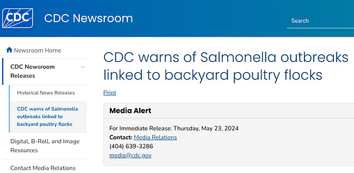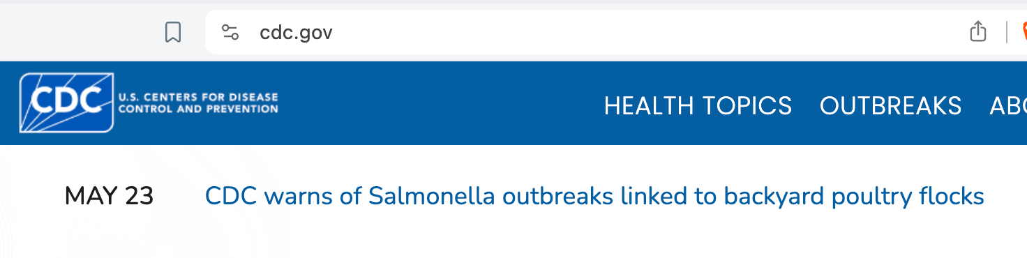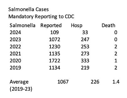 A search for poultry and salmonella on the CDC website reveals no such investigations or public reports for commercial poultry operations. There are NO reports for 2024, 2023, 2022, 2021, 2020 or 2019 (the archives stop at 2019).