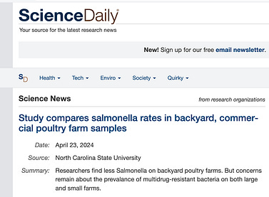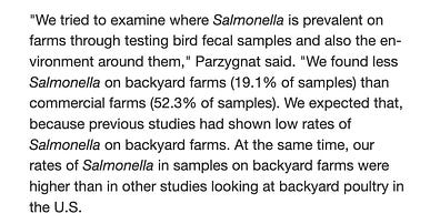 But it gets worse; recently, North Carolina State University conducted a study that documented backyard and small farm poultry operations are infected with salmonella at a much lower rate than commercial plants.
