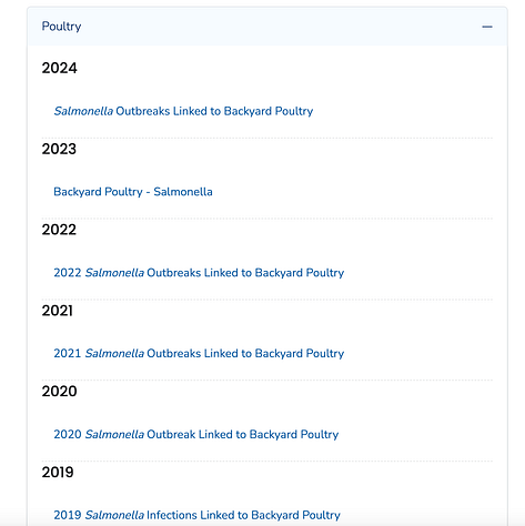 A further dig into the CDC archives reveals that for the past six years, the CDC has conducted successive investigative “reports” on Salmonella outbreaks linked to backyard poultry. In fact, they write numerous articles on the subject each year.