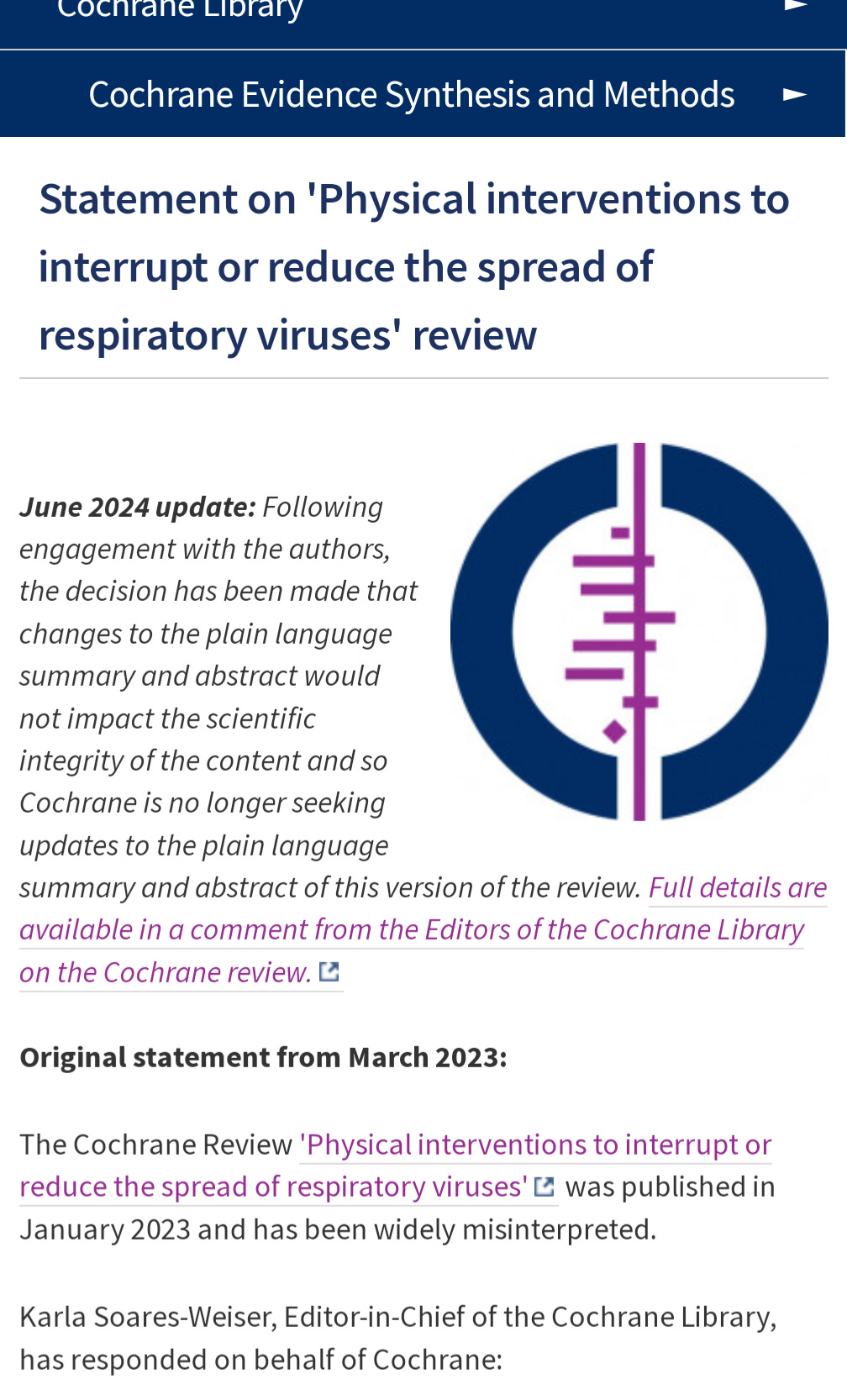 The Editor in Chief of Cochrane was unhappy with the popular interpretations of the analysis and issued a rare statement saying they would rethink the wording to make it clear that masks *might* work bc the confidence interval was broad.