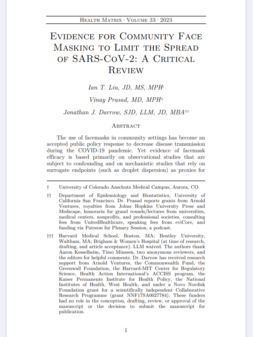 During the pandemic, my colleagues and I performed a systematic review of community masking. We found simply no good evidence to support masking or mask mandates.