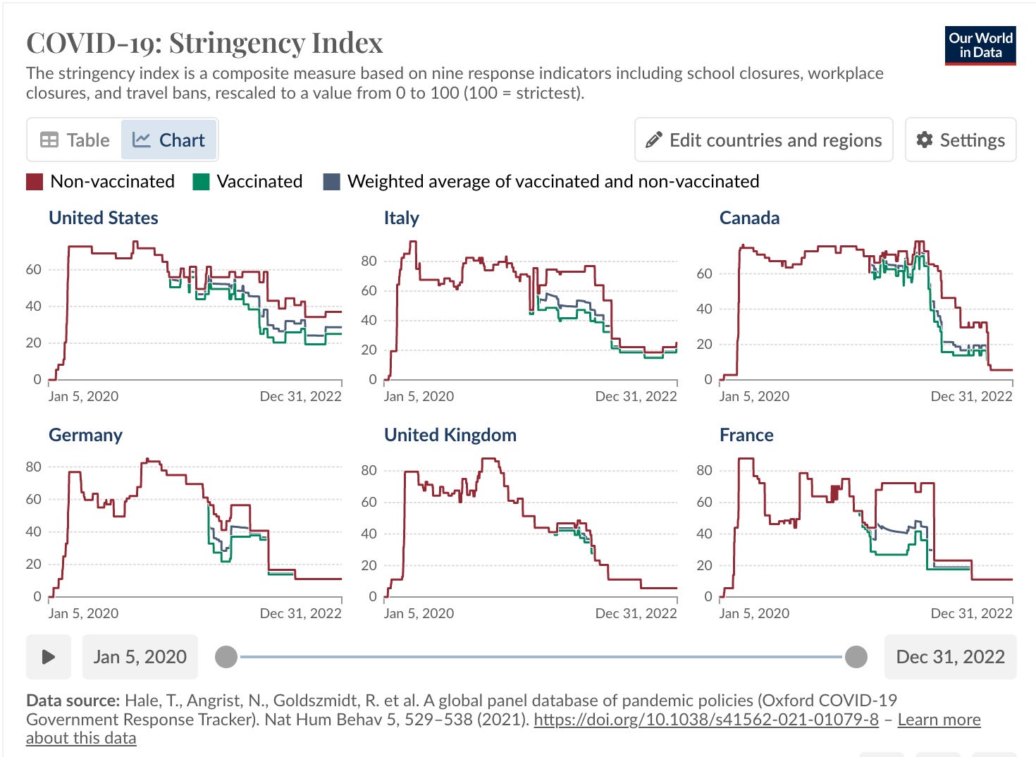 Personally, I am fascinated by the fact that there is a metric identified as the “Government Response Severity Index” which has been used to basically quantitate the force of totalitarian measures implemented by governments on their citizens during the COVIDcrisis! This metric is otherwise known as the COVID-19 “Stringency Index”, and summary data from “Our World in Data” can be found here with example data from selected countries in the figure below. For those who want more details, you can find the academic, peer reviewed publication which defines this metric here, under the title “A global panel database of pandemic policies (Oxford COVID-19 Government Response Tracker)”.