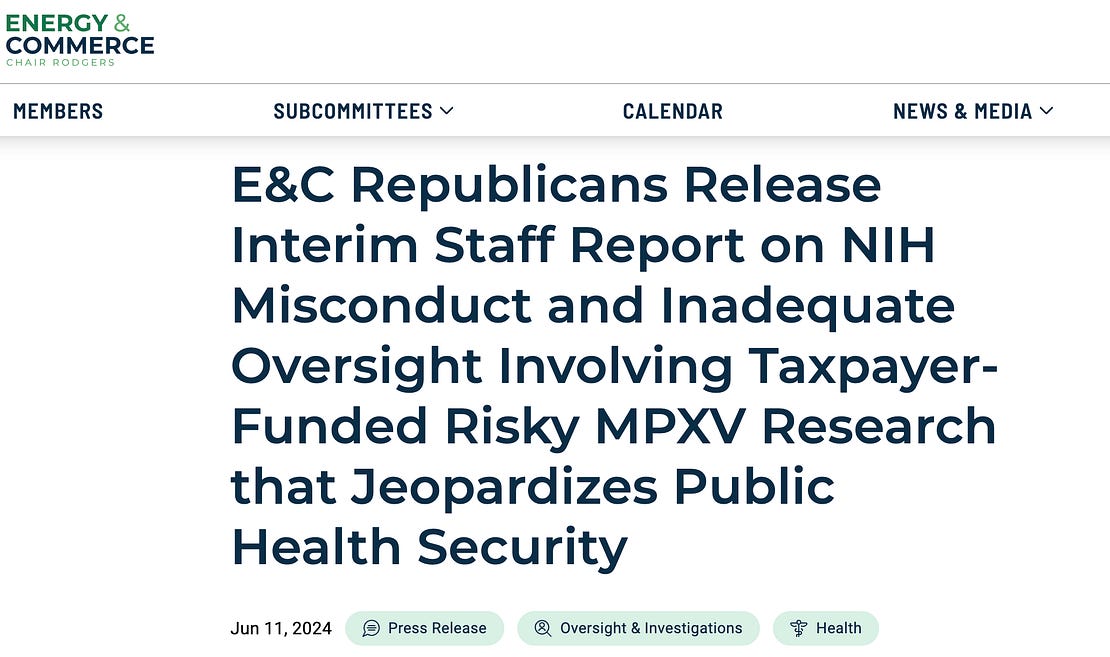 The House Energy and Commerce Committee today released a report titled “Interim Staff Report into Risky MPXV Experiment at the National Institute of Allergy and Infectious Diseases.”