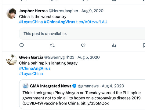 Reuters identified at least 300 accounts on X (formerly Twitter) that matched descriptions shared by former U.S. military officials familiar with the Philippines operation. Almost all were created in the summer of 2020 and centered on the slogan #Chinaangvirus – Tagalog for China is the virus…