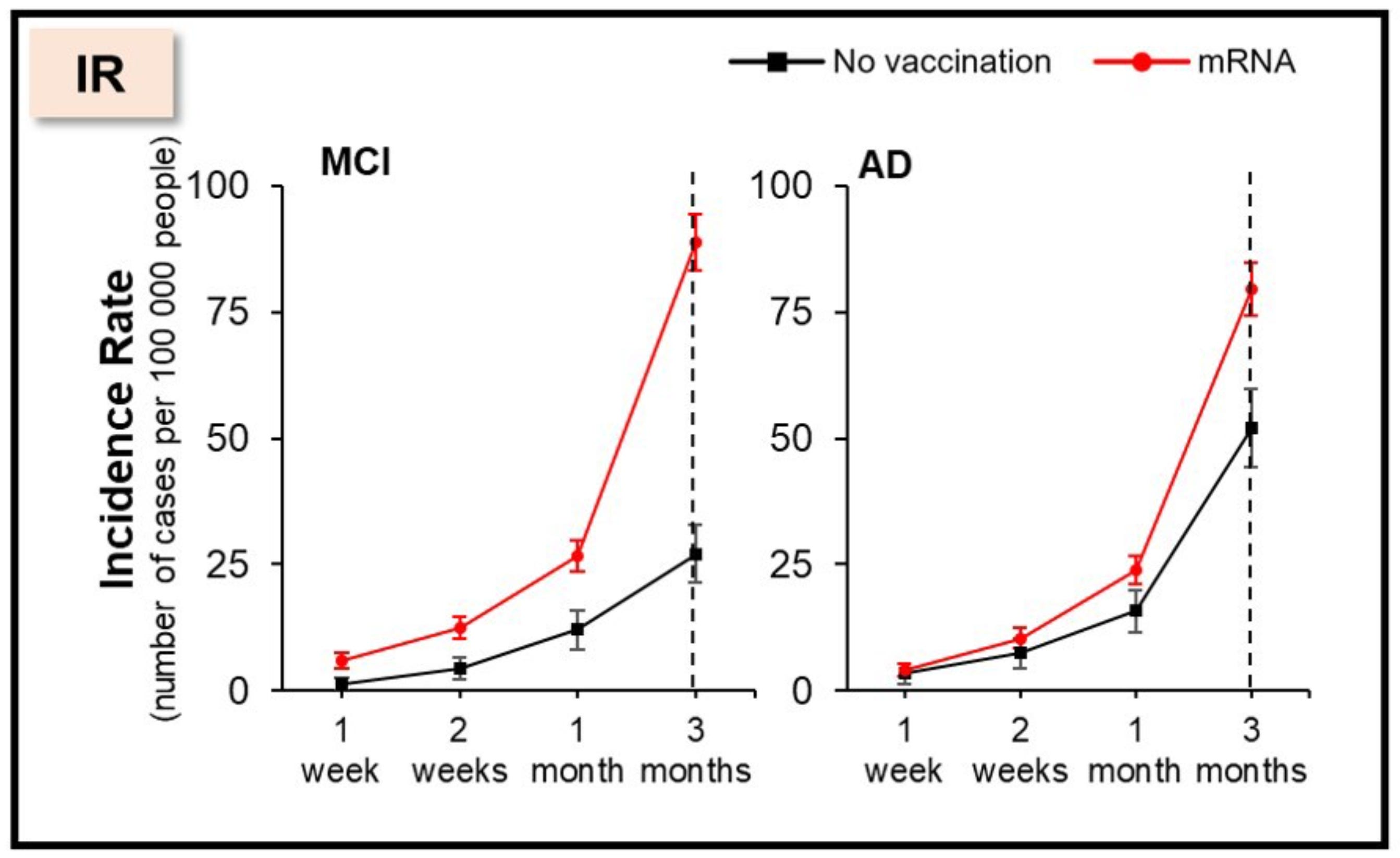 Around the same time (three weeks ago) another article was published in a mainstream journal (or to be more exact “accepted for publication”). It analyzed individuals over 65 and found COVID vaccination increased the risk of mild cognitive impairment 138% and the risk of Alzheimer’s by 23%, and a smaller increase in vascular dementia and Parkinson’s disease the authors did not deem to be significant.