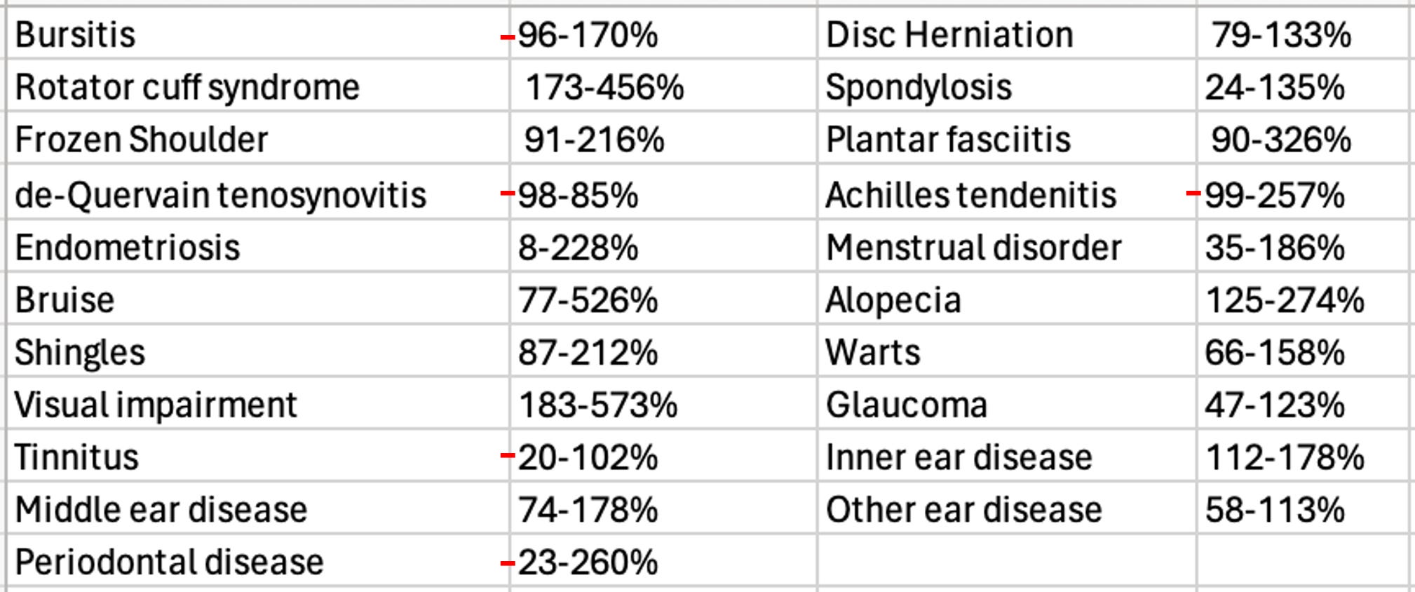 In November 2023 and March 2024, some very interesting data emerged from a team of South Korean researchers where they looked at the electronic health records for a quarter and then half of the population in Seoul (2.2 million for the first study and then 4.3 million for the second) and then compared the rates of a variety of new (non-serious) medical conditions in those vaccinated and unvaccinated over three months. From this, they found a variety of medical conditions had a significant increase in the vaccinated. Those increases were as follows (with a range existing depending on how long after vaccination they were compared and which COVID vaccines they received).