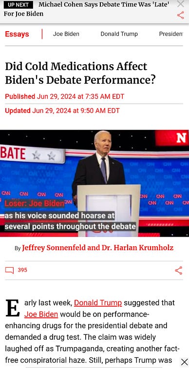 Obviously, these comments are so delusional that they represent wishful thinking driven partisan bias. Had Trump exhibited anything remotely similar to Mr. Biden, the same commenters would be writing op-eds about the wonders of donanemab, or phoning in levodopa to Walgreens. They would be calling for him to undergo cognitive testing, drop out, and more.