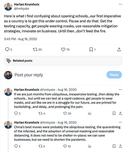 Harlan said this during the fall of 2020, when most of Western Europe had reopened schools. DeSantis had reopened, and we desperately fought to reopen schools in SF, LA and more liberal enclaves. Studies from Germany had shown that school reopening does not drive community spread.