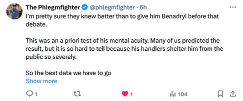 When Trump had COVID, some doctors claimed we should use the 25th amendment to remove him. Trump famously debated while having COVID19(with the severity of illness seen in 2020— not the cold like virus we have now in 2024), yet that performance was nothing like this weeks.