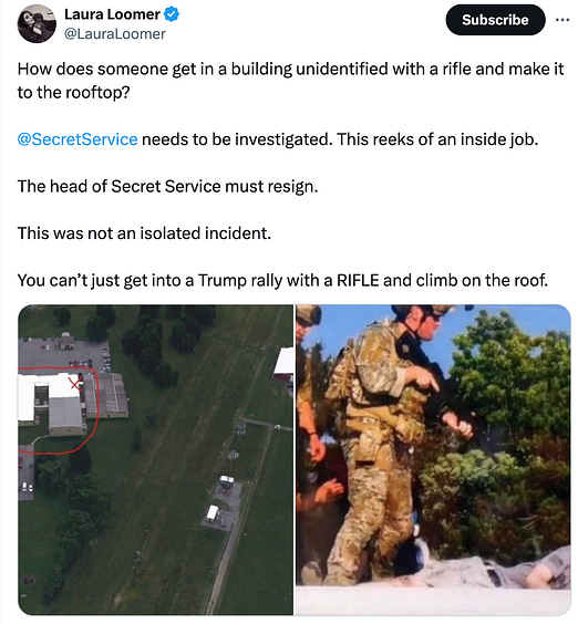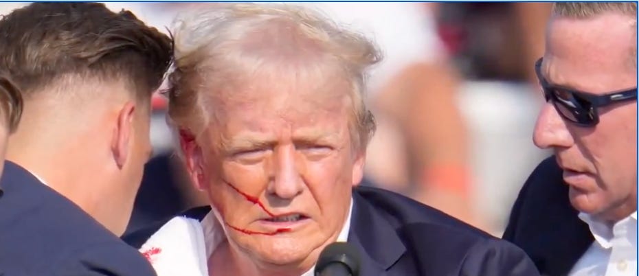 During a Trump rally in Pennsylvania, an Antifa-affiliated shooter named Mark Violets climbed up on top of an unprotected building with a long rifle at a range of less than two football fields from the podium. This was noticed by people in the crowd who attempted to alert Police and Secret Service. Apparently to no effect. Apparently a single shooter. The shooter then had an unencumbered straight line of sight to the President as he was speaking, and took multiple shots before Police snipers (not Secret Service) took out the shooter- but not before he killed one Trump supporter, critically injured two others, and hit President Trump in the ear lobe.