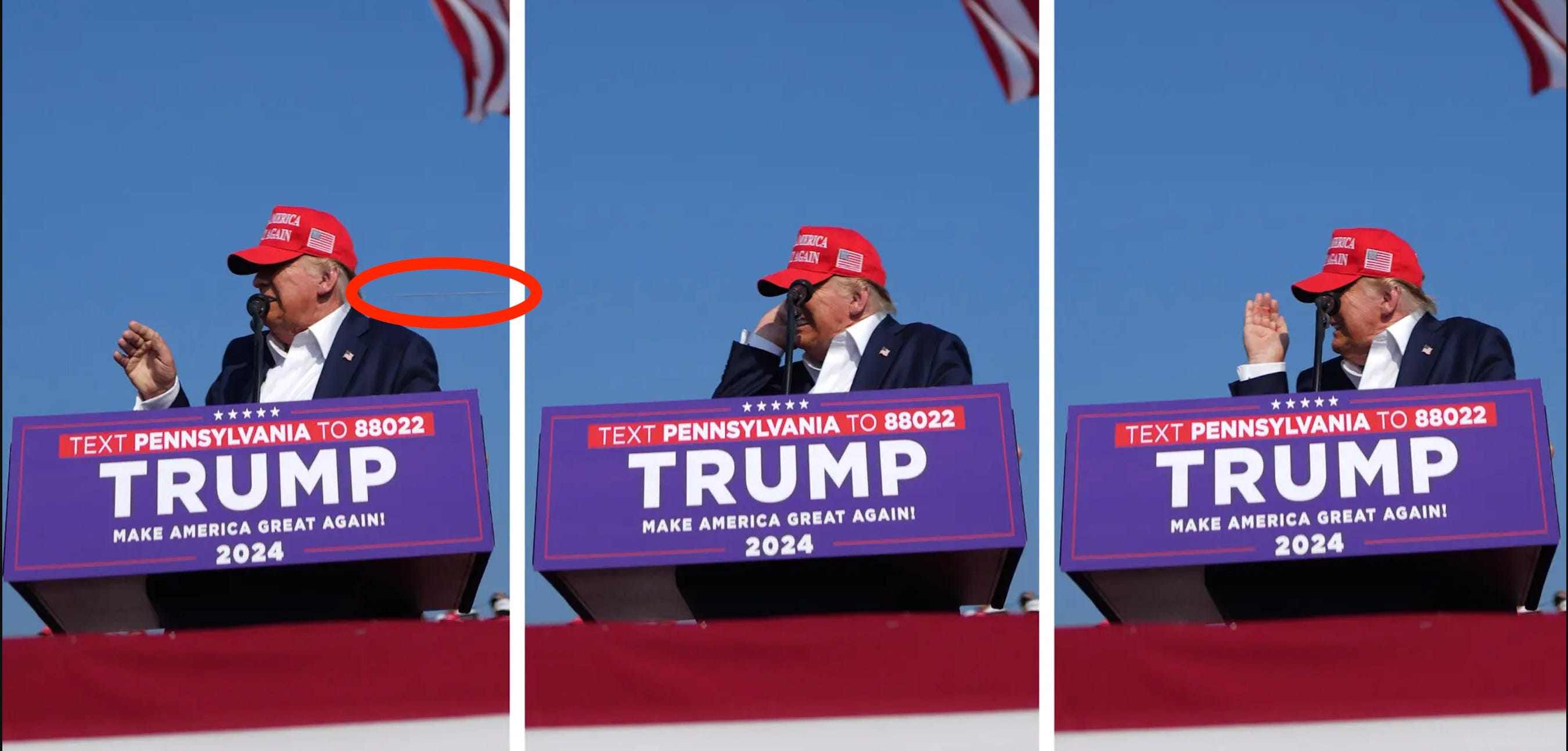 It appears that as Trump was speaking to the crowd, he started to turn his head in response to the Police sniper activity behind and to his right just before the bullet hit him, which slight turn of head saved his life. In this video clip you can see Trump reach up and touch his ear as he drops down, just before the police sniper shots on target are taken.
