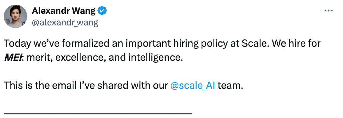 As a result, everyone who joins Scale can be confident that they were chosen for their outstanding talent, not any other reasons. MEI has gotten us to where we are today. And it’s the same thing that’ll get us where we’re going, as we embark on our next chapter focusing on data abundance, frontier data, and reliable measurement to accelerate the development and adoption of AI models.