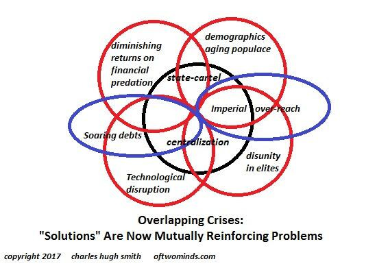 The super-wealthy play a key role in this choice of response, and this fragments the elites into warring camps, a dynamic I’ve addressed many times over the years, including in my chart of some of the overlapping crises that will demand more than duct-tape responses: