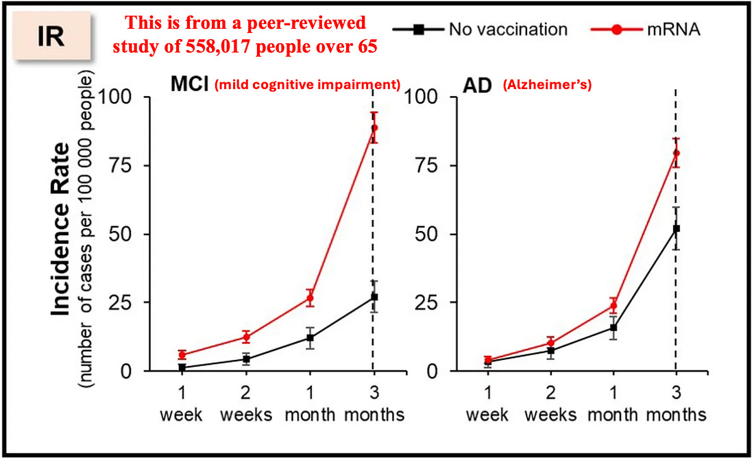 •A more recent study of 558,017 Koreans over 65 found vaccination increased the risk of cognitive impairment by 138% and the risk of Alzheimer’s by 23%, and that this risk increased with time.