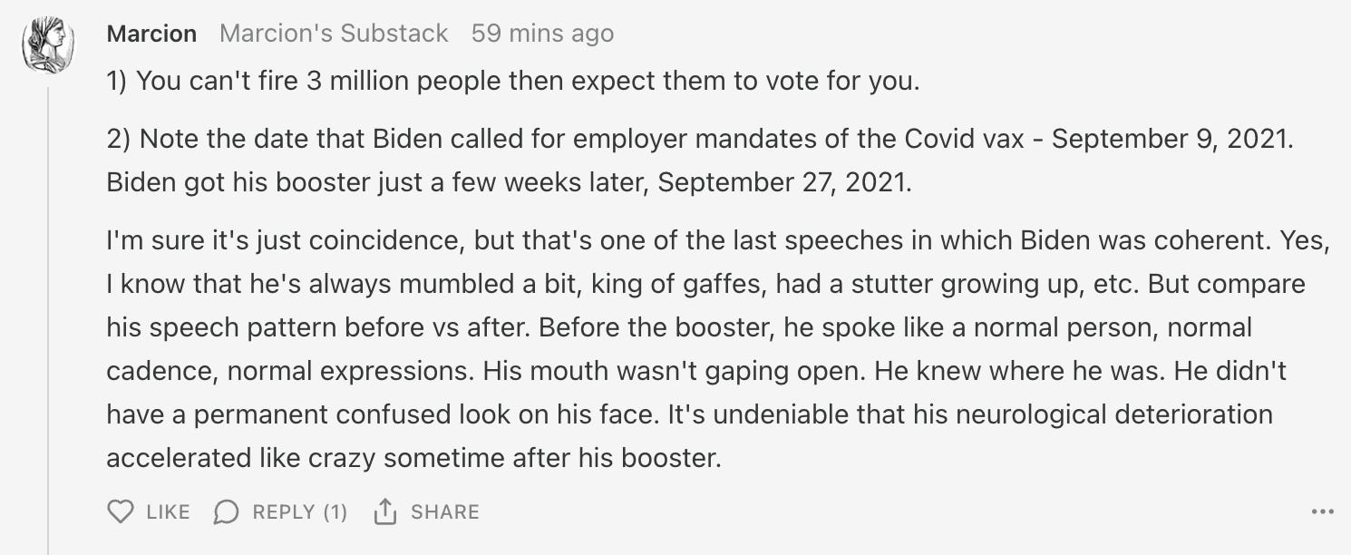 One of the central points of contention with my previous article about Biden’s progressive cognitive impairment was that many understandably doubted Biden actually took the vaccine. Being aware of this counterargument, I focused on the psychology I saw at work in the vaccine proponents (e.g., one Congressional Democrat was so invested in the vaccine he continued to attack its critics even after his vaccinated teenage daughter had a sudden cardiac death while sleeping—something which previously never happened to healthy children).