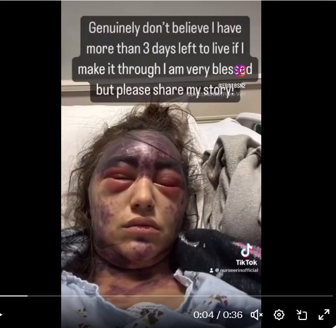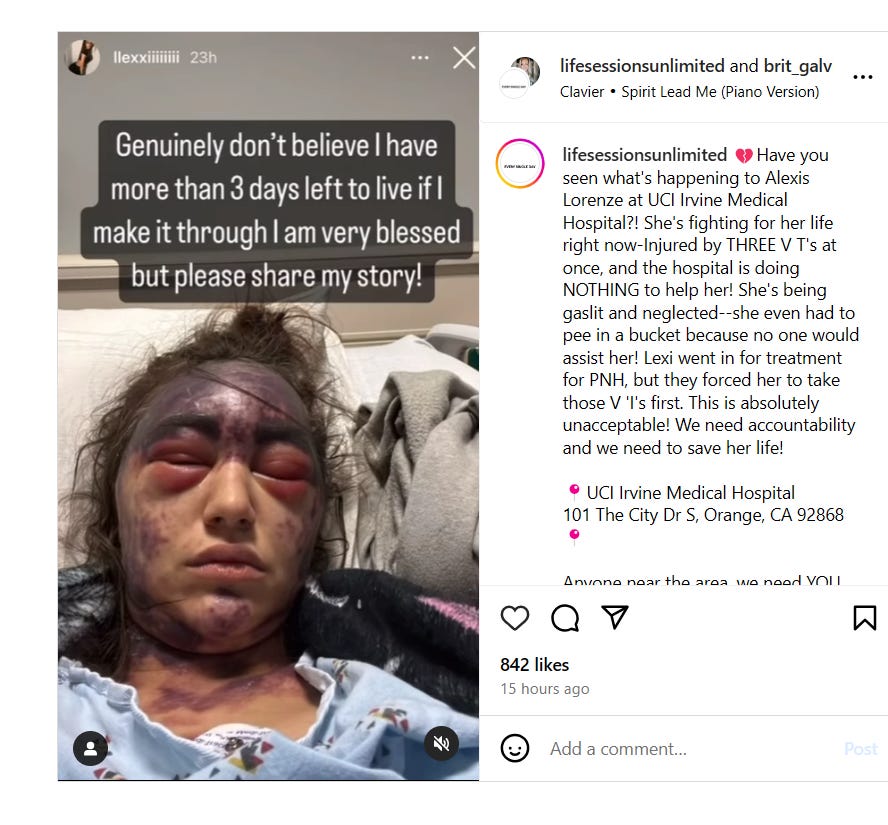 This is a very serious vaccine injury and Alexis is now fighting for her life in the hospital. After her vaccine injury, UCI Health did nothing to alleviate her condition. They just gave her medications for dealing with the pain.
