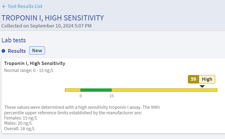 Her Troponin I was high at check in which is an indicator of heart damage.