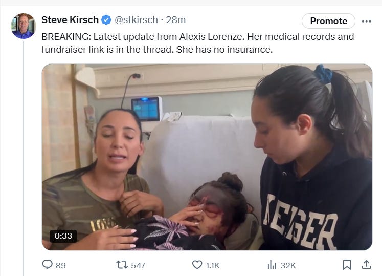 See this very short video and thread for the latest updates on the story. This video was taken at 4pm on Tues, Sep 17, right before she checks out of the hospital to take a $50,000 ambulance ride for 1 hour to a hospital that will treat her.