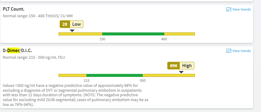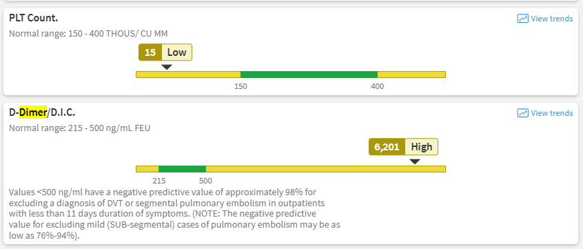 Look at the value on check-in (Sep 10) for PLT and D-Dimer: