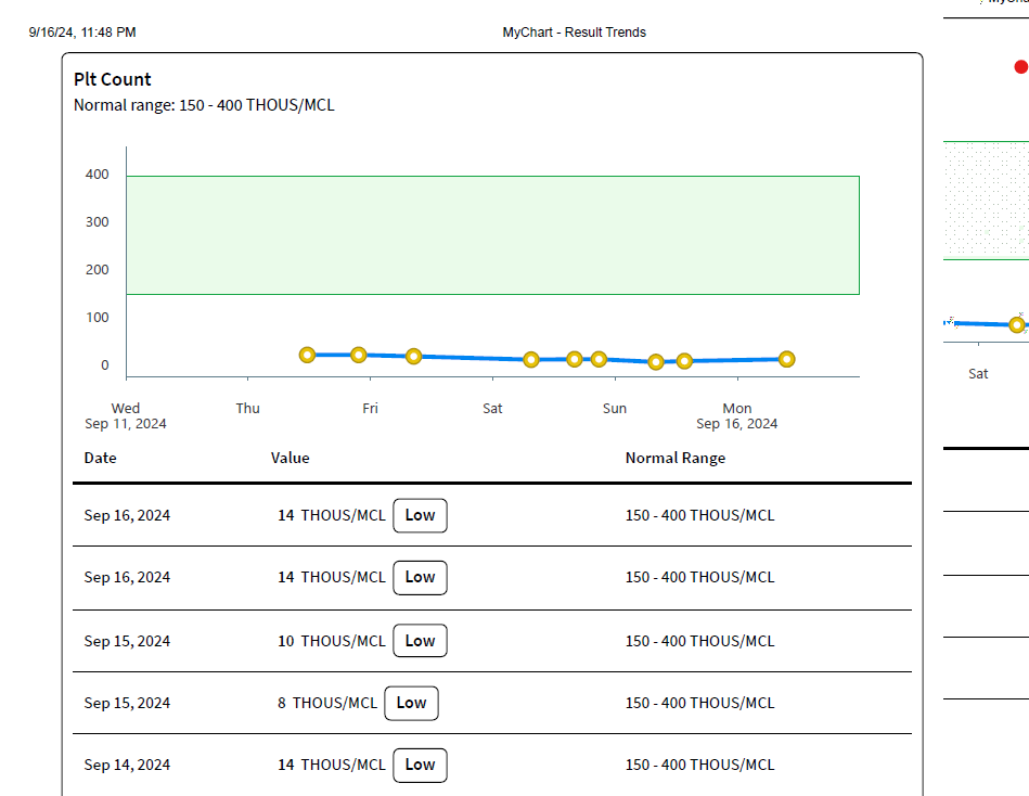 Fri, Sept 13: Given platelets by IV. Doesn’t seem to increase her counts. They did bone marrow biopsy and 2-3 transfusions.