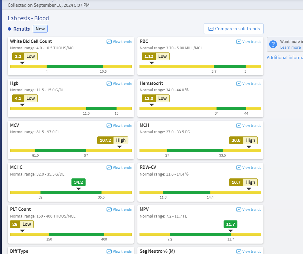 Tues, Sept 10: She has PNH and had terrible migraines for the last 2 weeks. Went in for help. Checked into UCI Hospital. ABNORMAL ECG – Sinus tachycardia Abnormal T, consider ischemia, anterior leads. Her HR is 131 bpm. Her hemoglobin was 3.1 (severely low). Her platelets were