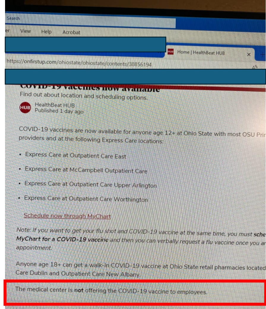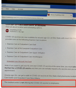 Lets start off with this screenshot of a webpage from OSUMC’s website which provides information to the public as to where they can get Covid-19 vaccines. Check out the highlighted sentence at the bottom of the page: