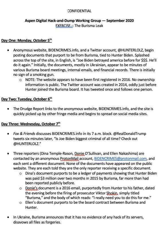 If that story is new to you, the Twitter Files revealed that in August 2020 the Aspen Institute organised a “table-top” exercise with Twitter, Facebook, First Draft, and a host of media organisations including the New York Times and Washington Post, that ran through a day-by-day playbook of how they would respond to the release of a Hunter Biden laptop. The story didn’t break publicly until October, so how did the Aspen Institute know two months in advance?