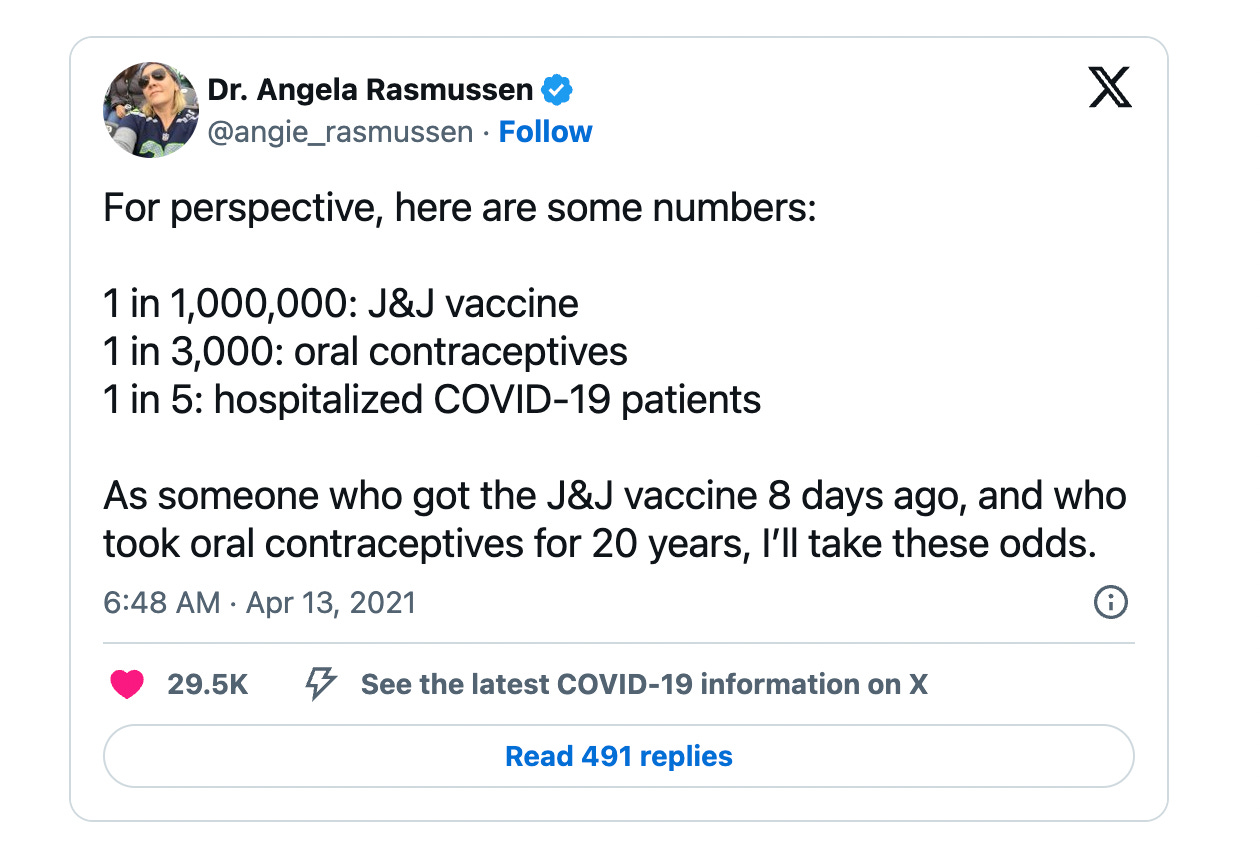 VITT is nothing like a DVT from oral contraceptives. VITT is devastating— causes brain herniation and death— while a leg DVT is easily treated. Angela was so wrong that eventually both J&J and AZ shelved the entire adenoviral vector vaccine program. Also the risk of VITT was 1 in 40k not 1 in a million. Public health experts talking about masking kids, or social distancing, and many other aspects of pandemic response were mostly just repeating things they read in the media, rather than independently critically evaluating topics.