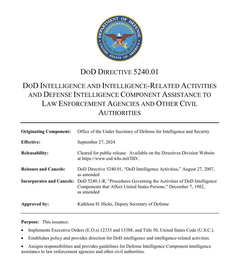 “As the U.S. prepares for one of the most controversial and closely watched elections in its history, a concerning update to DoD Directive 5240.01 has quietly been put into effect. Reissued on September 27, 2024, this directive governs the Department of Defense’s (DoD) intelligence activities and now includes provisions authorizing lethal force in certain circumstances when assisting civilian law enforcement. While the directive forbids assassination, it opens the door to lethal interventions under “national security” conditions….
