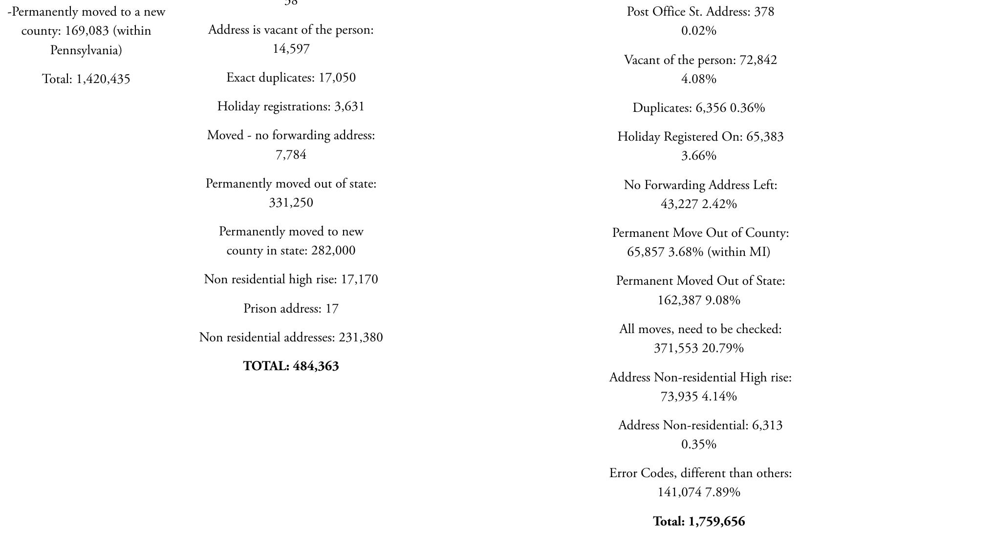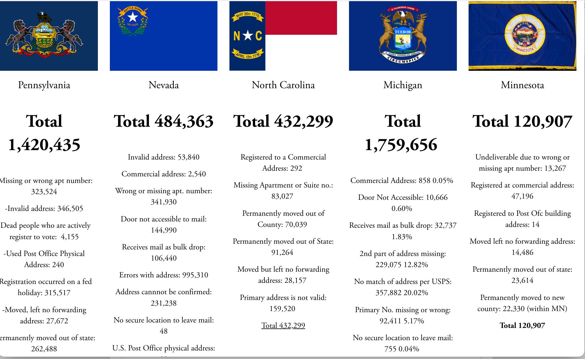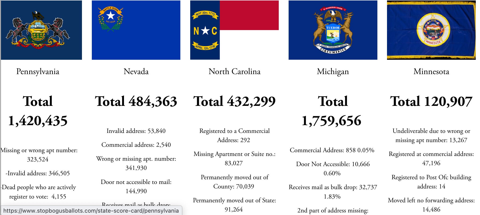 As below. Dead, moved away, at camp ground, at commercial building, bulk drop, out of state, out of county, felon, migrant halfway house, etc. Ballot harvesters submit fraudulent ballots for individuals long gone. Again, these fraudulent voter registrations are enough to overwhelm any Trump vote in the swing states. You will see listed the categories of illegal addresses. These votes will not be voted by the registrant.