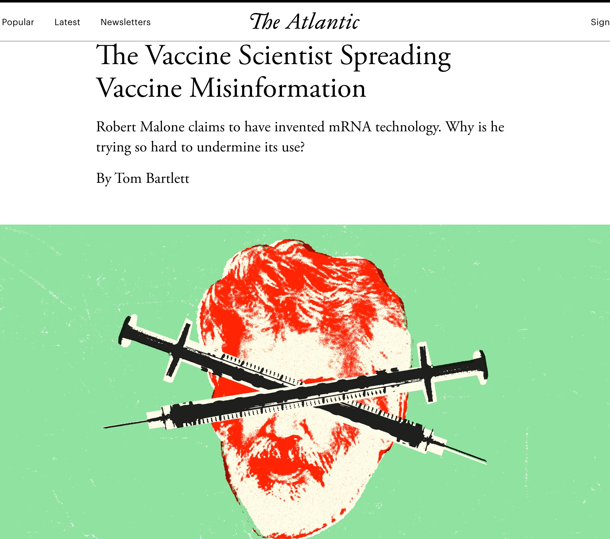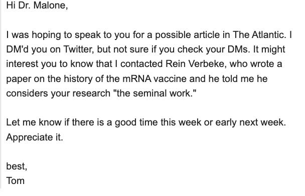 I learned this fact in 2021 when a writer/editor from The Atlantic Monthly named Tom Bartlett contacted me, first by email and then in a telephone call, saying with much flattery that he wanted to do a story on the origins of the mRNA vaccines and my role in the invention. His original email to me was:
