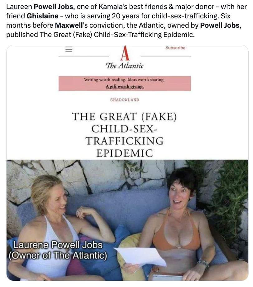 Turns out that the Atlantic Monthly is owned by none other than the widow of Steve Jobs. Yep – that Steve Jobs. Her name is Laurene Powell Jobs (known in the Harris camp as LPJ) and her best, best friend is Kamala Harris. Rumor has it that LPJ was the person that propelled Kamala into the position of presidential candidate – after Biden’s implosion. That LPJ has been behind the rise of Kamala Harris all along – as their friendship goes back many years to their time in San Francisco together. In 2003, Laurene Powell jobs first donated her campaign in SF for district attorney. They have remained best friends ever since.
