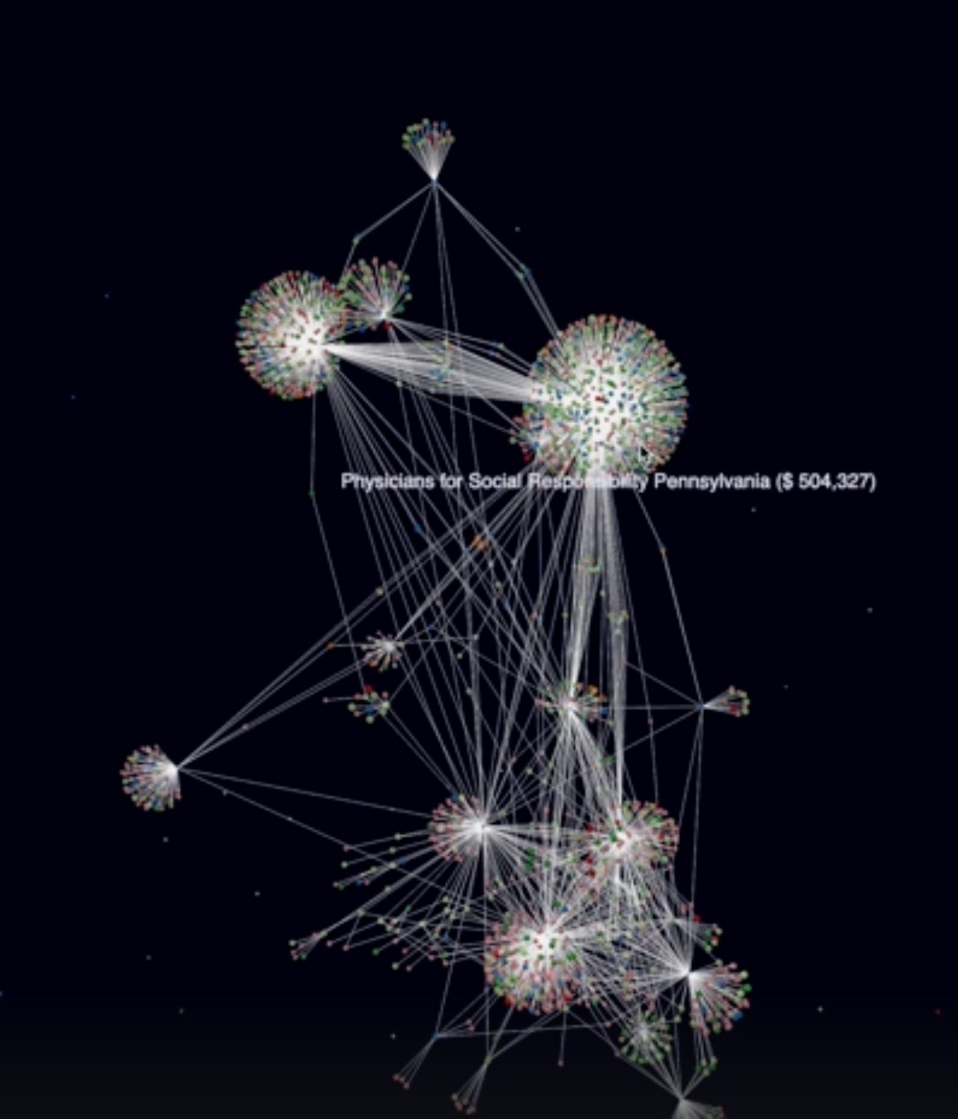 This is a map of the operatives that Tides funds in the U.S. alone. It spends between half and one billion dollars annually. This below, is called the cluster view. Every dot in an organization. At this juncture they are all working on the election. There are 2500 clusters, but they give to another 37,000 operative organizations across the U.S. Again, claiming to be ‘grass roots’, steered from head office, and at least some of the staff in a grass roots outfit are out of New York, D.C. or San Francisco.