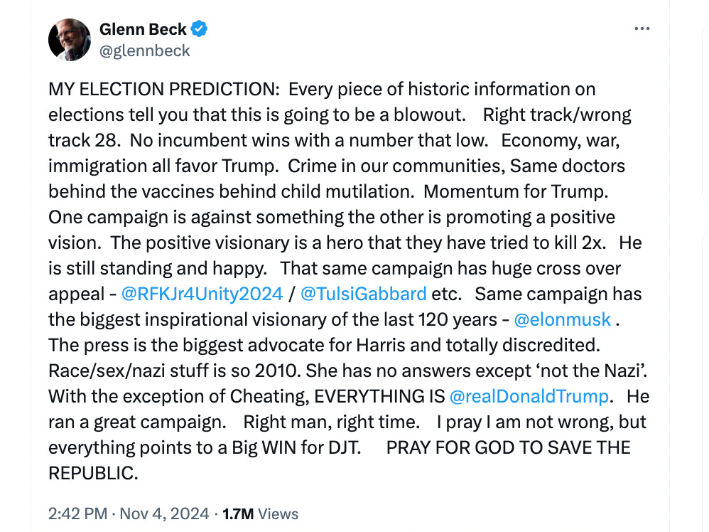 “NH and VA. If they are close, it’s a big night <for Trump>. We will also know GA fast. If bleak, then a rough night. So, the tone gets set early. If all states are tight, it will come down to these crazy mail-in rules. Some don’t require postmarks. There may be civil unrest. Pray we don’t have to wait until Friday. It will take all week if it is tight. I’m currently refreshing all of my in-state analyses. I can’t find anything wrong with our projections at this point. The turnout machines for the (D) party are just not performing like the prior election cycle. The union workers just are not turning out for Harris. They don’t want to work for her. And the minority precincts in places like Georgia are just not turning out like they need them to. We have pretty good leads in the swing states, but we won’t know until late tonight.” What really matters is what happens with the House elections. If the (D) party surges in the House, then we will see immediate impeachment efforts. No matter what, there will be no break, no honeymoon, they will go right back at the lawfare and other efforts to delegitimize and deny him the opportunity to be sworn in if he wins at the ballot box.