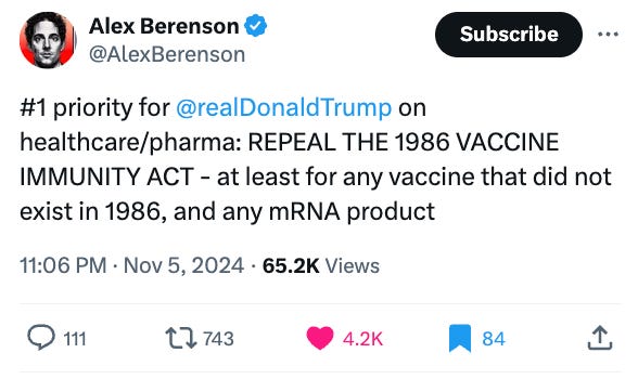 - Repeal vaccine indemnification. Alex Berenson is 100% right here