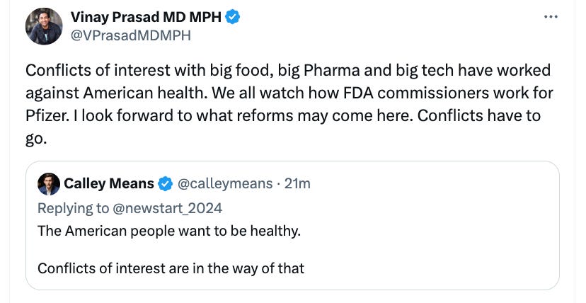 - Conflict of interest has to go. One reason the American health care system is so broken is doctors take money from Pharma, FDA officials go to work for Pharma, Big agriculture lobbies congress.