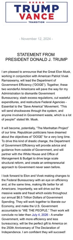 I am pleased to announce that the Great Elon Musk, working in conjunction with American Patriot Vivek Ramaswamy, will lead the Department of Government Efficiency (‘DOGE”)….