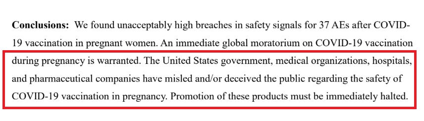”When normalized by time-available, doses-given, or number of persons vaccinated, all COVID-19 vaccine AEs far exceed the safety signal on all recognized thresholds. These results necessitate a worldwide moratorium on the use of COVID-19 vaccines in pregnancy.”