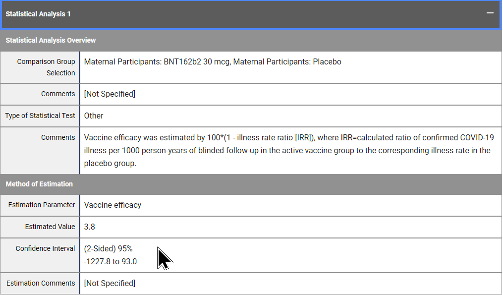 Was there a benefit? Nope. Moms in both groups got the same number of COVID infections (2 in each group). Vaccine efficacy estimated at a measly 3.8 (because the groups were different sizes). A perfect vaccine is 100. A vaccine which does nothing is 0. The 3.8 value was both tiny and NOT statistically significant. It’s entirely possible that the vaccine increased your risk of getting COVID. We can’t tell from the study.