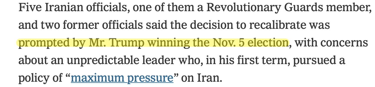 The Trump Effect continued apace yesterday. The latest to begin falling in line is Iran. The New York Times ran the story yesterday headlined, “With Trump Returning and Hezbollah Weakened, Iran Strikes a Conciliatory Tone.”