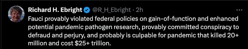 Richard H. Ebright (on X):  Fauci provably violated federal policies on gain-of-function and enhanced potential pandemic pathogen research, provably committed conspiracy to defraud and perjury, and probably is culpable for pandemic that killed 20+ million and cost $25+ trillion.