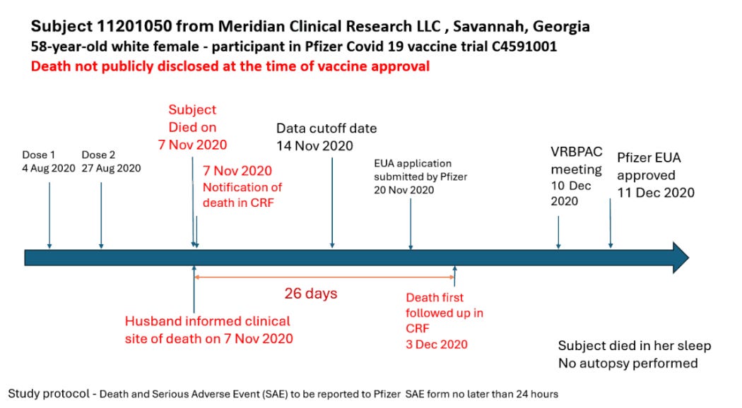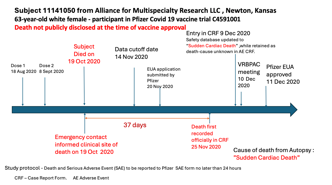The Kansas case was a 63-year-old woman who had her first dose of the Pfizer mRNA vaccine on August 18, 2020, and a second dose on September 8, 2020. She died on October 19, 2020, and her emergency contact immediately informed the clinical site — Alliance for Multispecialty Research LLC, in Newton, Kansas. Thirty-seven days later, on November 25, 2020 — 11 days after the data reporting cutoff date — the death was finally recorded in a “case report form.”