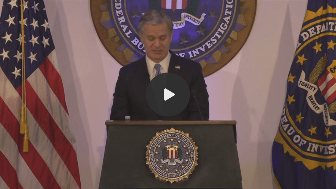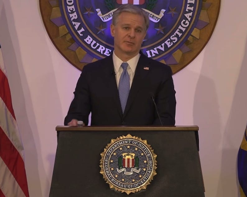 In typical oleaginous fashion, Wray touted the bureau’s alleged achievements under his leadership—fighting the trafficking of illegal drugs, protecting children from predators, thwarting cybercrime, blah blah—by “abiding by the rule of law and adhering to our core values.” Whatever that means.