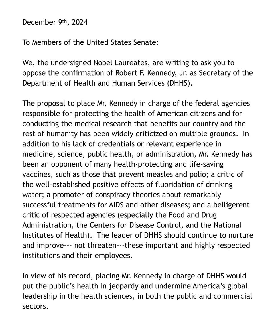 As one voice, the laureates write: “In view of his record, placing Mr. Kennedy in charge of the DHHS would put the public’s health in jeopardy and undermine America’s global leadership in health sciences, in both the public and commercial sectors.”