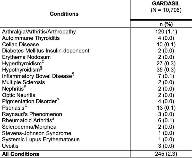 For reference, this is what is stated in Merck’s package insert for the vaccine, which discussed all the (reported) autoimmune disorders that developed throughout its clinical trials.