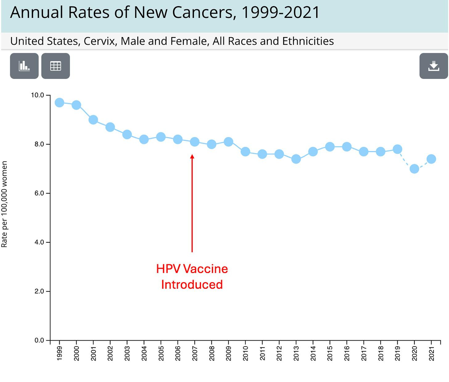 Note: it is quite unfortunate a carcinogenic vaccine was able to be marketed to prevent a (fairly rare) cancer–especially since Gardasil (like the mRNA vaccines) was never tested for its cancer risk and trial data showed elevated leukemia rates.