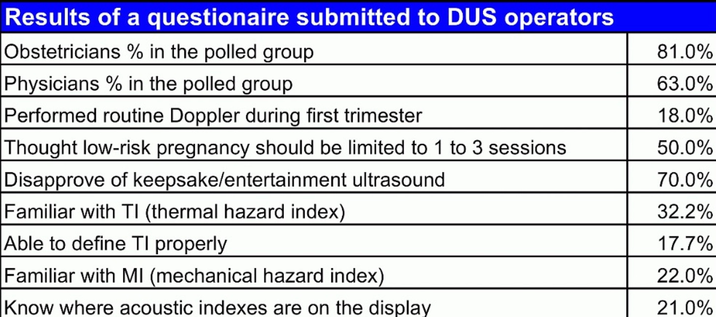 Second, they decided it was acceptable if the machines provided information on the current US strength so the operator could moment by moment decide if that risk justified the potential diagnostic benefit—which was absurd as almost no one was ever trained in the dangers of US (e.g., this 2007 survey highlights that lack of training):