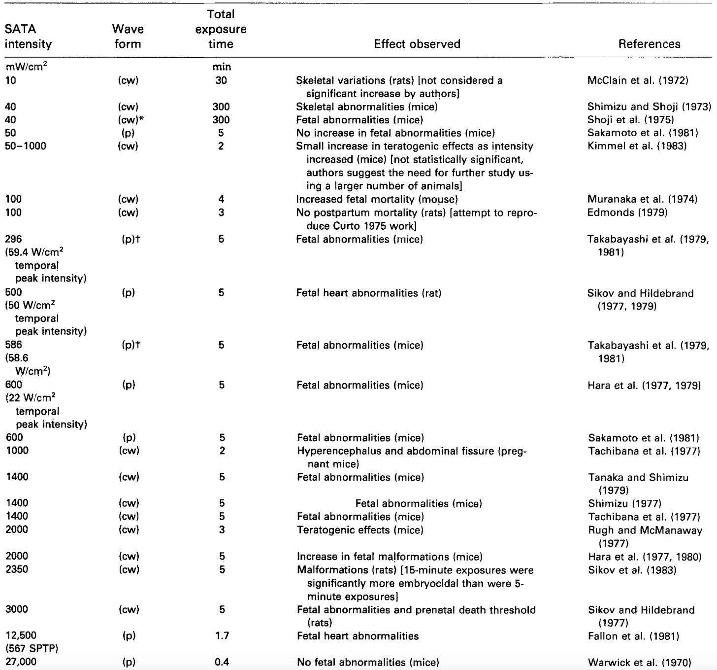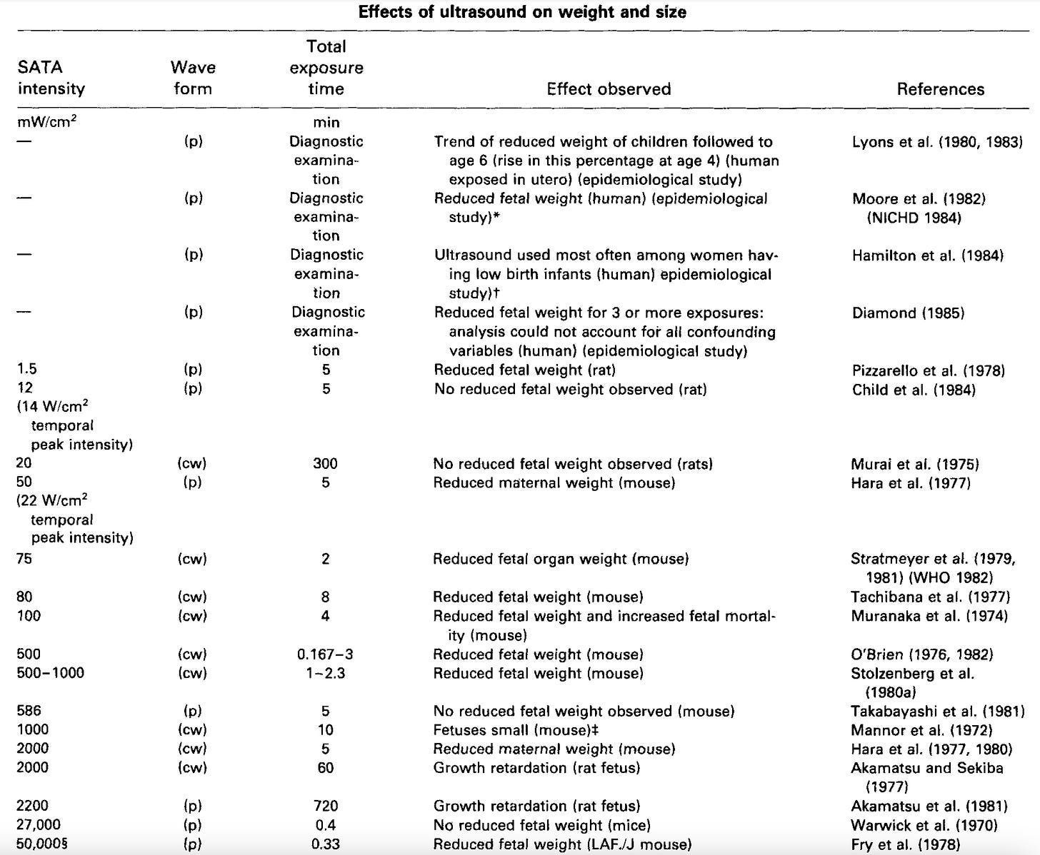 Furthermore, this 2011 review (which to my knowledge is the most comprehensive review that has been written on the harms of ultrasound) highlighted that there is some variability in both machine outputs and in how ultrasound strength is calculated (which can lead to stronger than permitted ultrasound emissions—e.g., due to machines underestimating the heat they generate), and that there are significant variations in the maximum strengths allowed. Additionally, the FDA does not consider the total time of ultrasound exposure when making these guidelines: